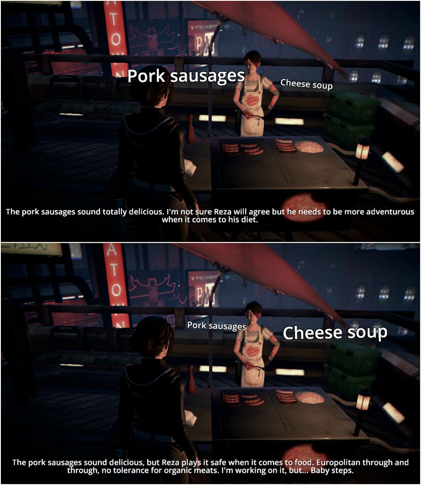 Zoe knows that Reza would prefer his usual order of cheese soup, but she also wants to broaden Reza's culinary horizons, and the pork sausages are hard to say no to. So, it's up to you as the player to make the choice.